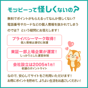 モッピー は総合No.1と言われることも多く、 ポイントサイトを使うならまずは登録しておいて損はありません。高ポイントにポイント還元率も良く、1P=1円と分かりやすいです。はじめての方におすすめといえるモッピーからポイントサイトを始めましょう。