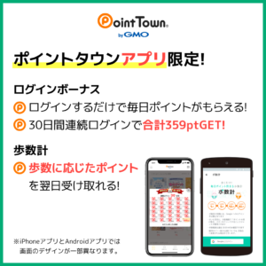 ポイントタウンにはiPhone、Androidともにスマホアプリがあり、スマホアプリ限定のコンテンツがあります。
