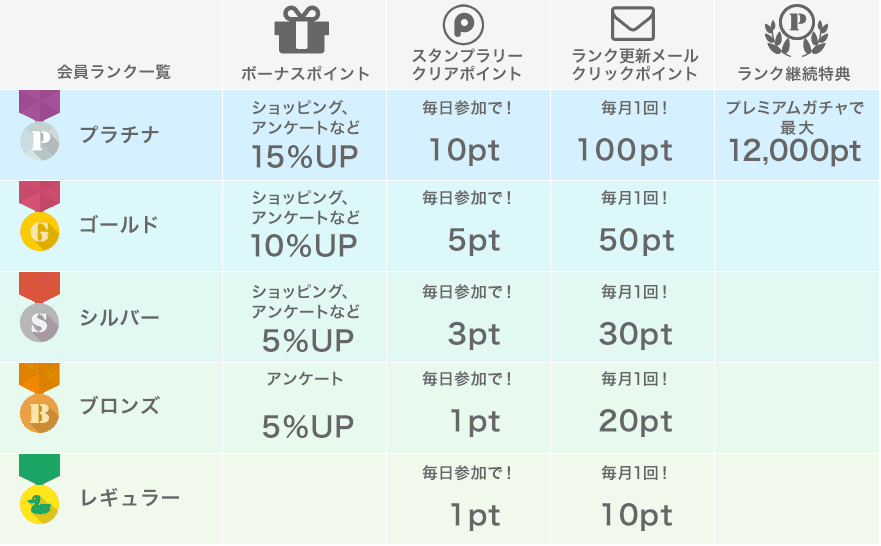 ポイントタウンは会員ランクでもらえるボーナスポイントが最大15%と大きく、ショッピングだけでなくモニターやスタンプラリー等様々なサービスで恩恵を受けることができますので、会員ランクを上げるメリットが非常に高いと言えます。