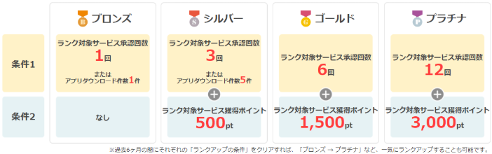 プラチナ会員になるには過去6ヶ月の間に、対象サービス承認回数12回+対象サービス獲得ポイント3,000ポイントです。平均月2回のサービス利用と500ポイント獲得で達成可能です。条件はそれほど厳しくありませんのでプラチナ会員を目指してみると良いでしょう。