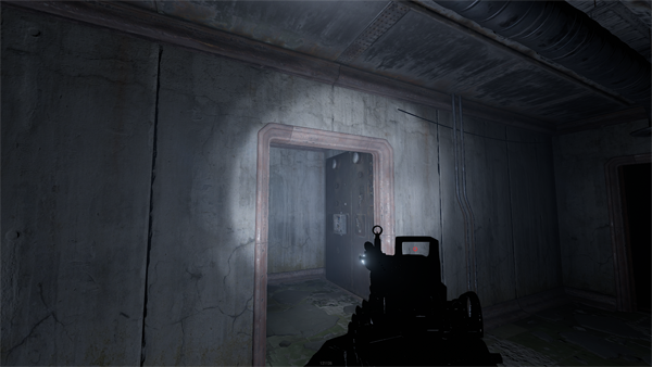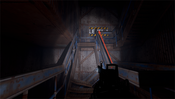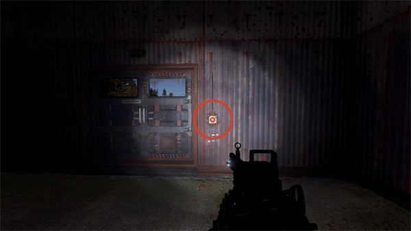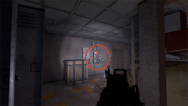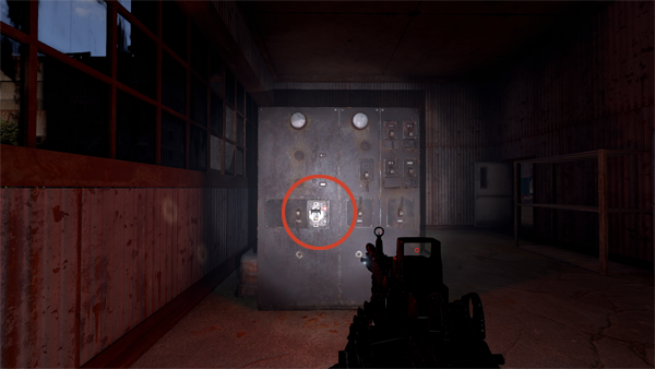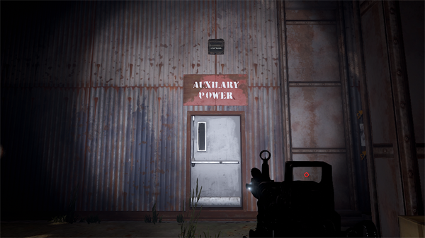 階段を降りて脱出する場合は、1階まで降りて中に入り、AUXIRALY POWER(補助電源)と書かれた部屋に入りスイッチをオンにすることでドアを開けて外に出ることができます。中にいる敵NPCに発見されるので危険です。