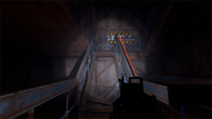 左のレッドキーカードドアから建物に入った場合は階段があります。壊れて下が抜けている階段は、手すりの上に上がることで登ることができます。