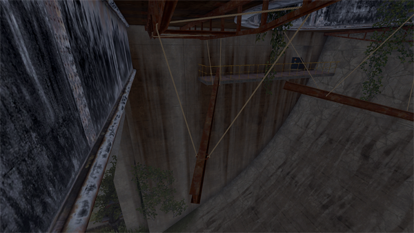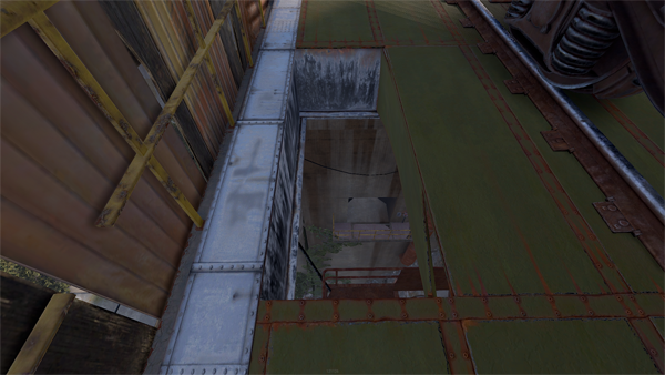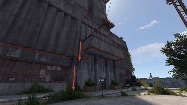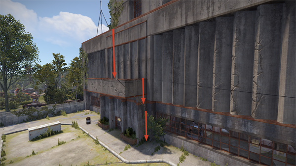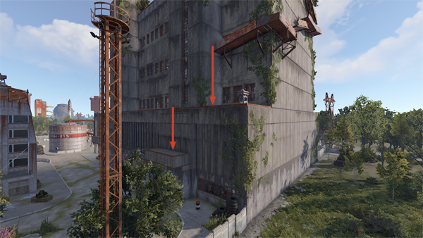 脱出する時は屋上に降りるためのスロープがあるので利用します。↓の画像のスロープでは、行き止まりの場所から壁に擦りながら落ちることで落下ダメージをなくして降りることが可能です。