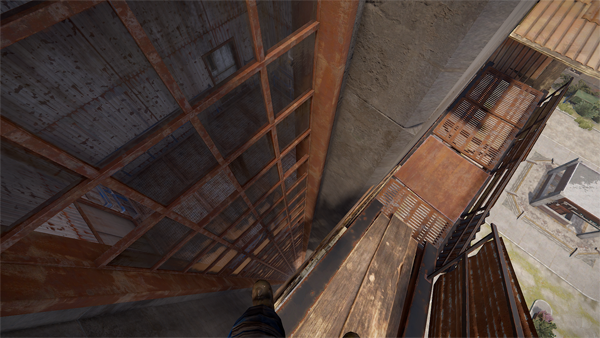 ↓の画像のスロープでは、途中の窓がある窪みに窓枠に引っかかりながら落ちることで、落下ダメージをなくして降りることが可能です。近くにある箱を回収し、後は同じ様に入口の屋根部分に壁を擦りながら降りて、次に電線を支える棒に一度引っかかるように降りれば落下ダメージをなくして脱出することが可能です。