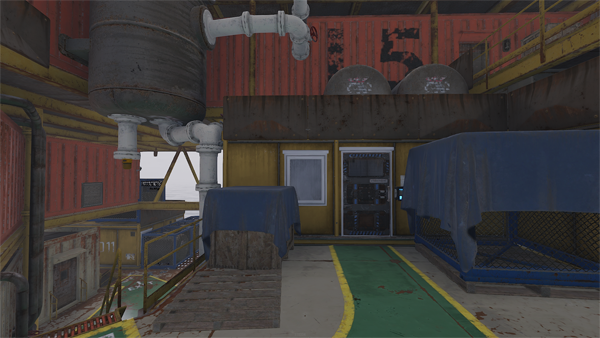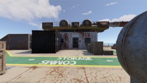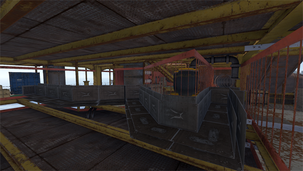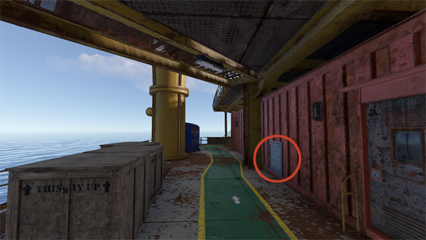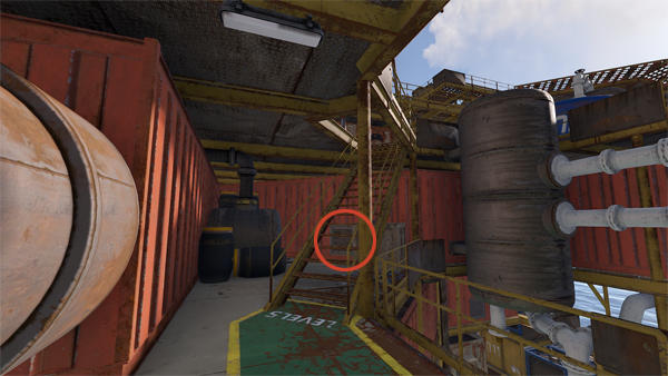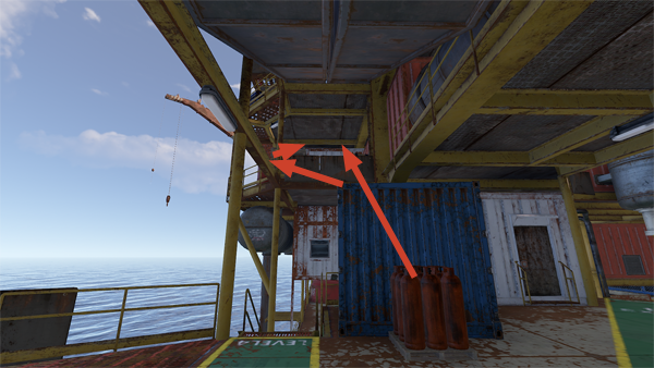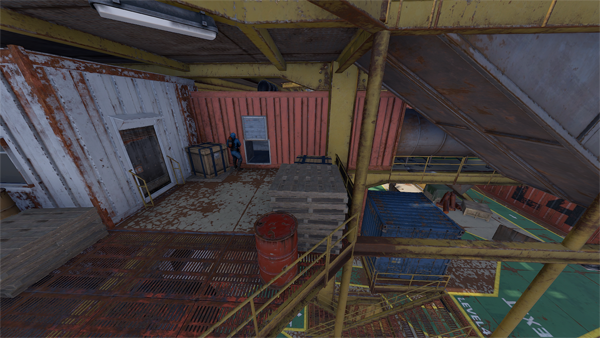 ロックドクレートのタイマーがオンになると、輸送ヘリがやってきて重装備科学者11人がやってきます。よく行われている攻略法は、クレーンに隠れながら倒す方法です。↓の画像のクレーンにフェンスの上に乗ってから梯子を使って登ることができます。