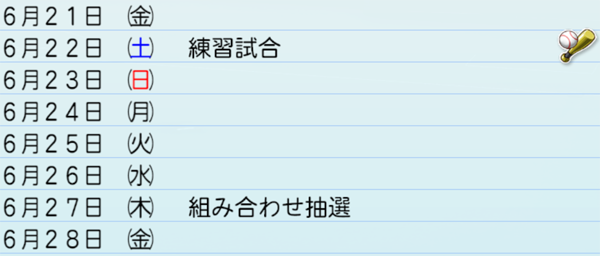 6月22日(土)に練習試合がスケジュールされています。夏の都道府県大会が、7月2日からですので、大会10日前に練習試合ができていることになります。なら大会11日前まで申し込めるのかと言うと、この練習試合は大会17日前の6月15日(土)にしか申し込むことができません。翌16日(日)には練習試合の申込みができなくなってしまうのです。練習試合を行う日が同じでも大会が近づくと申し込むことができなくなるようで、どうやら練習試合が行われる日にちは関係ないようです。