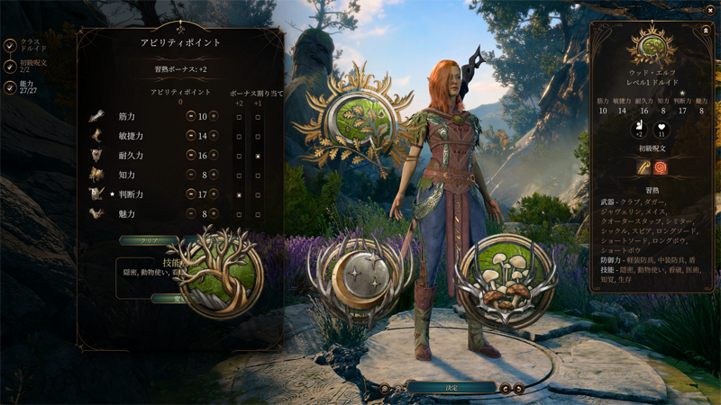 ドルイドで一番重要なステータスは判断力です。中装防具を装備できるので、敏捷力は14あると良いでしょう。精神集中のセーヴィング・スローのために耐久力も必要になります。