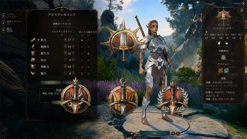 運動(筋力)、軽業(敏捷力)、歴史(知力)、動物使い(判断力)、看破(判断力)、知覚(判断力)、生存(判断力)、威圧(魅力)