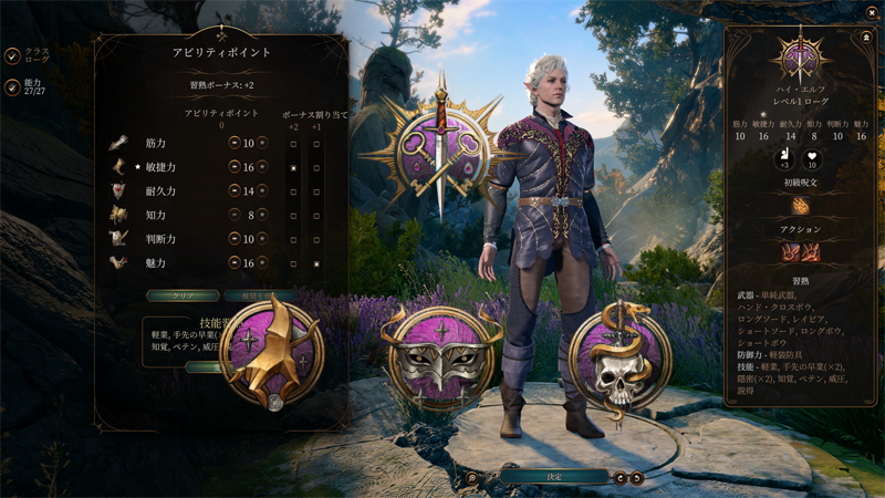 ローグは4つも技能習熟を選ぶことができます。軽業(敏捷力)、手先の早業(敏捷力)、隠密(敏捷力)と威圧辺りがオススメでしょうか。