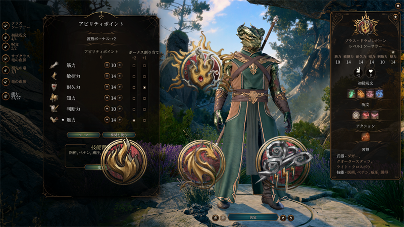 魔法学(知力)、宗教(知力)、看破(判断力)、ペテン(魅力)、威圧(魅力)、説得(魅力)