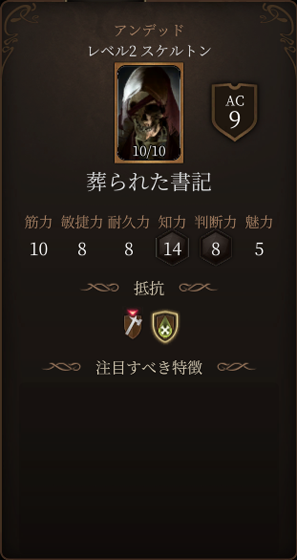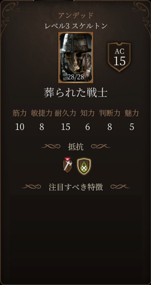 難易度7の知覚能力判定に成功するとボタンが強調表示されますが、失敗してもボタンは見えますし押せます。ボタンを押すか周囲に転がっている死体を動かそうとするとアンデッドが起き上がり戦闘になります。ボタンを押す時に事前に全員が隠密状態になっていると、イベントが発生しても発見されていないので奇襲攻撃をかけることができます。死体から装備品を取っておくことで武器を使うタイプは弱体化します。奇襲攻撃ができなかった場合は遠距離から呪文を使ってきて面倒なので、開いた扉の先の部屋に入り角待ち戦法で遠距離攻撃を避けながら戦うのがよいでしょう。殴打に脆弱です。この後大休憩推奨ですので全力で戦って大丈夫です。