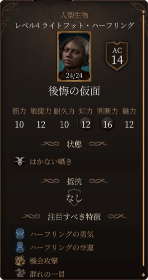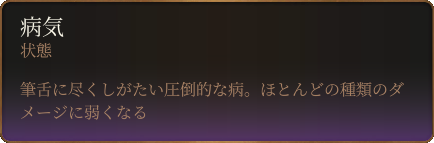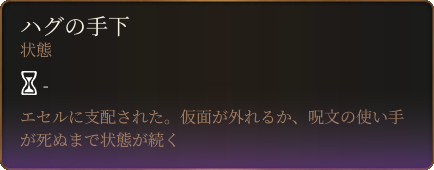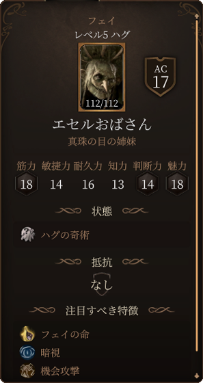 結局手に負えない魔法がかかっており寄生虫はどうにもならず、そのかわり「代償の支払い」状態になります。この状態は威圧判定に+1が付きますが、知覚判定とハグへの攻撃が不利になります。さすがにいらないのでおすすめしません。またユニーク消費アイテム「エセルおばさんの護符」がもらえますが、このアイテムのためにやる必要もないでしょう。