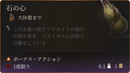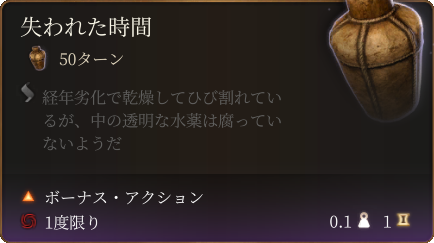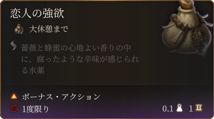 10種類の薬品「失われた時間」「弱まる意思」「恋人の強欲」「母の憎しみ」「消えたペット」「狂気の接吻」「石の心」「破られた約束」「萎れた夢」「高鳴る鼓動」があります。ほとんど悪い効果のものなので使えませんが、「石の心」など良い効果が発動する物もあります。