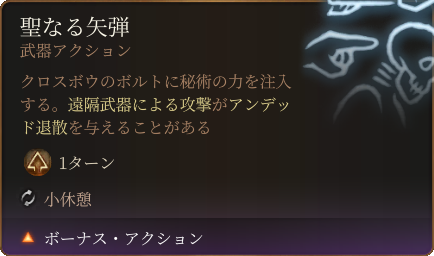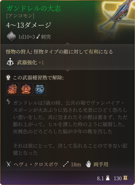 怪物タイプに対して有利をとれる武器強化+1も付いた強力なヘヴィ・クロスボウです。アンデッドに対して有効な矢弾を使用することもできるので対アンデッド戦でも活躍します。「狩りのショートボウ」と同じように装備しているだけで怪物タイプに対して近接攻撃も呪文も有利になる優れものです。