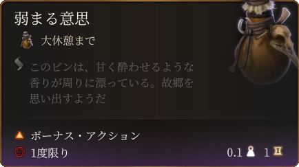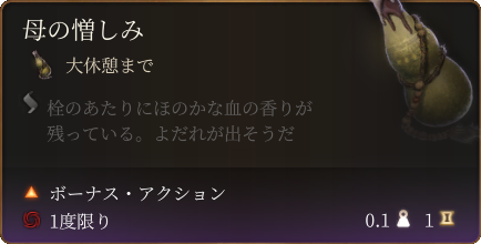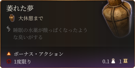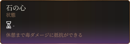 大休憩まで毒ダメージに抵抗ができます。エセルおばさんの薬品の中で唯一のまともなバフ効果が得られるものです。