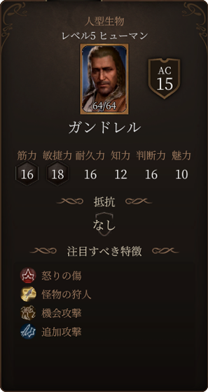 戦闘になった場合、ガンドレルはアスタリオンを優先的に狙ってきます。レベル5の追加攻撃持ちで、HPが40%以下になるとクリティカル・ヒットを出してくる強敵です。全力で短期決戦を挑みましょう。倒すとユニークアイテム「ガンドレルの大志」を奪うことができます。