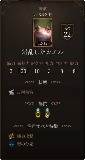 エセルおばさんのせいで狂ってしまっているカエルです。ACが22もあり戦闘になると異様に強く、倒しても1経験値しか手に入らないため戦う価値はありません。遠距離攻撃や呪文を最初の一撃だけ跳ね返す反射粘液の能力をもっていますがカエルの最初の行動で消えている可能性が高いです。HPが低いので必中の魔法の矢を使えば簡単に倒せます。