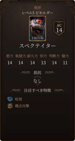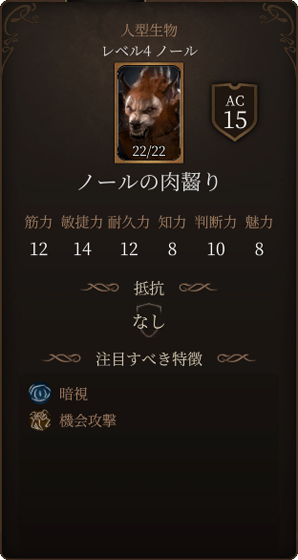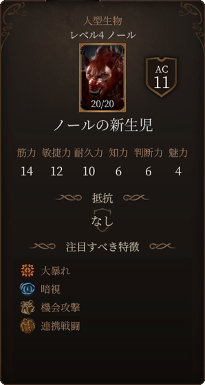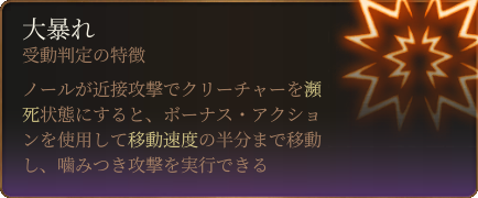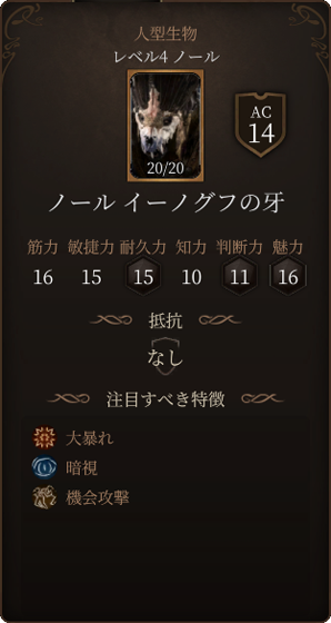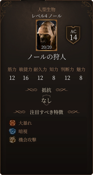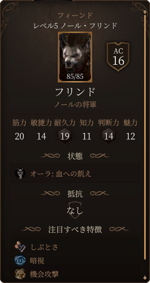 フリンドの攻撃力は高く、一度に30以上のダメージを与えることも可能です。また麻痺状態や狂気状態にもしてきます。狂気状態になると近くのクリーチャーを敵味方関係なく攻撃するようになってしまいます。ノールの狩人と同じく沸騰する怒りを使用できるので、3ターン目に3回攻撃をされて酷い被害が生まれます。ACも16と高めですので、戦うのであればレベル4以上になってからさらにイリシッドの力の好ましい始まりで命中率を強化するなどすると良いでしょう。