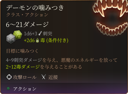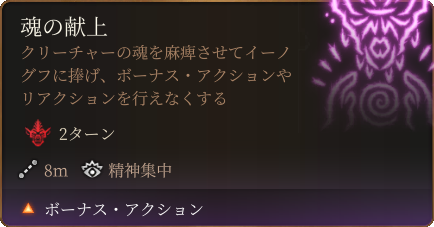 イーノグフの牙は、追加の毒ダメージもあるデーモンの噛みつきや、ボーナス・アクションとリアクションを封じてくる呪文である魂の献上(魅力セーヴ)も使用してきます。