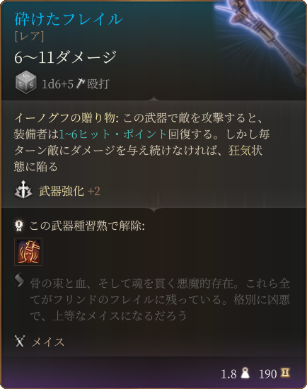 武器強化+2のため強力なメイスです。攻撃する度に回復できますが、毎ターンダメージを与え続けなければ狂気状態になってしまいます。攻撃ロールを有利にできるパラディンなどのレベル5以上で追加攻撃ができればデメリットはさほどありません。