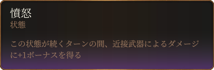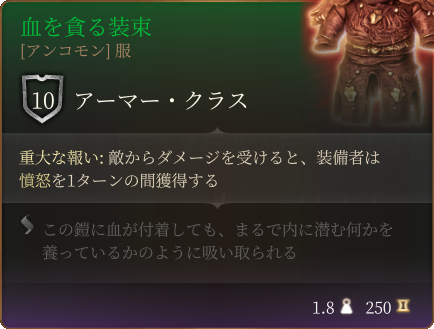 説明は誤りで、敵からダメージを受けると憤怒を2ターン獲得する服装備です。近接武器によるダメージが増えるのでバーバリアンやモンク向きの服です。素手攻撃には憤怒の効果は出ないので注意しましょう。