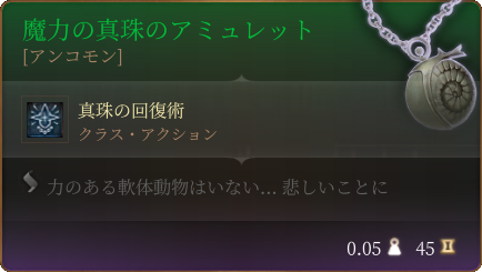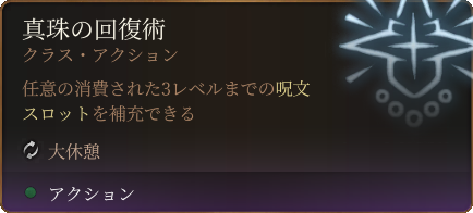 大休憩に一度「真珠の回復術」を使用できるアミュレットです。任意のレベル3までの呪文スロットを1つ補充できます。