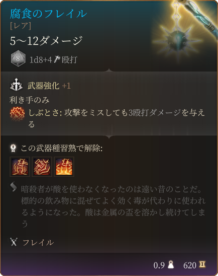 小休憩に一度「腐食の一撃」を使用できるフレイルです。酸の追加ダメージを与え、酸溜まりを作ります。