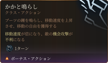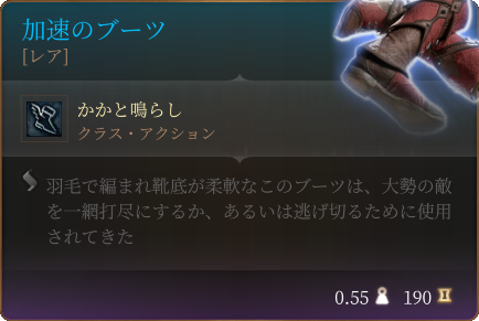 ボーナス・アクションで「かかと鳴らし」を使用することで、移動速度が倍になり、敵の機会攻撃が不利になるブーツです。なかなか役に立つブーツです。