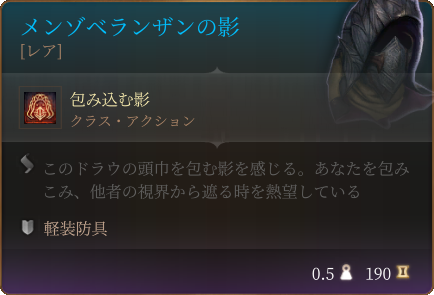 隠蔽状態の時に呪文セーヴ難易度に+1のボーナスを得られる頭防具です。