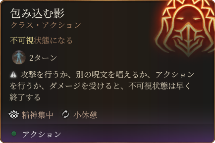 小休憩に一度2ターンの間不可視状態になれる「包み込む影」を使用できる頭防具です。ターン数がちょっと短めですが、敵に見つからずにアイテム漁りなどができる装備です。