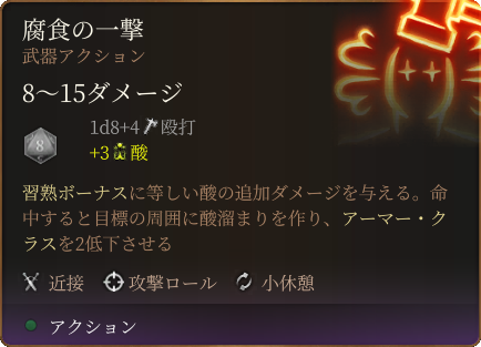 武器攻撃で追加の2酸ダメージを与えることができる指輪です。武器攻撃をするクラスに装備させましょう。最高難易度の自信家だとレア度がアンコモンからベリーレアになるようです。