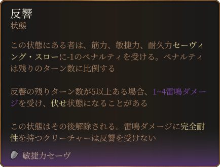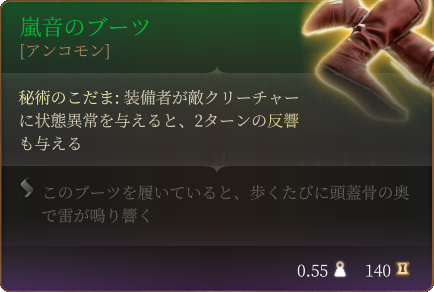 状態異常を与えると反響も与えるブーツです。反響状態になると筋力・敏捷力・耐久力セーヴにペナルティを受け、反響の残りターン数が5以上あると1d4雷鳴ダメージを受け伏せ状態になる場合があります。