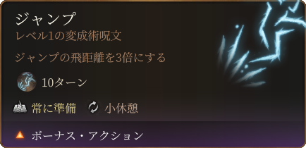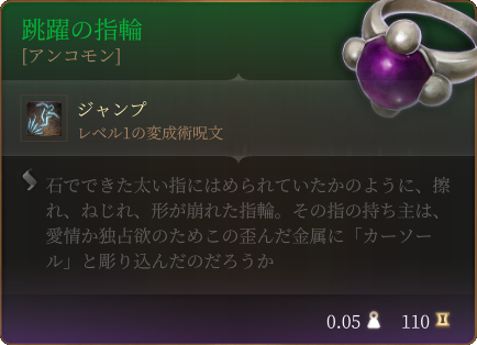 小休憩に一度強化跳躍と同じ効果のジャンプを使用できる指輪です。ボーナス・アクションで使用するため、シーフLv.3でボーナス・アクションを増やしておかないと同じターンにジャンプできないため使い難いです。