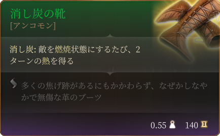 敵を燃焼状態にすると自身も火ダメージを受けますが、熱集中の効果で次の火ダメージに追加の火ダメージを与えることができるようになるブーツです。火ダメージ対策ができれば火系を専門に使用するキャスターが使用したいブーツです。