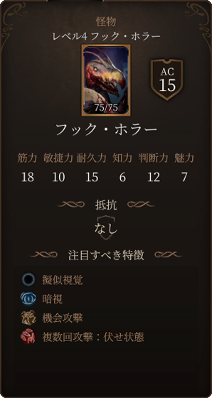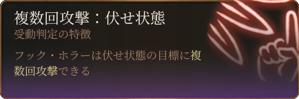 フックのホラーは「闇の木霊」で仲間に警告を発し援軍を呼びます。援軍は次のターンに現れます。視覚に頼らない生物だからなのか「鈎爪鳴らし」で近くの味方に正確な場所を伝えるようです。「飛びかかり」で伏せ状態にしてから複数回攻撃をしてきます。