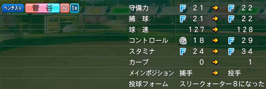 そしてこの野手から投手へメインポジションを変更した場合のボーナス的な能力値の伸びが、なんと何度も発生するのです。