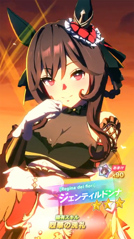 | 詳細 | 作戦・先行、中距離レース中盤のランダムな位置 [Regina dei fiori]ジェンティルドンナの強者の証の進化スキル ![]() |