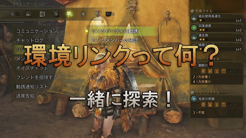モンスターハンターワイルズでクエストを他のハンターと一緒にプレイするのではなく、一緒にフィールドを探索したい時に役立つ「環境リンク」というものがあります。リンクパーティメンバーを環境リンクに勧誘すると、同じフィールドで一緒に探索をすることが可能になります。