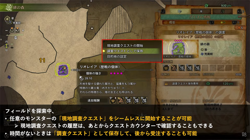 【モンスターハンターワイルズ】フィールドから現地調査クエストで豪華な追加報酬が狙える!さらにクエストの保存も【MHWs】