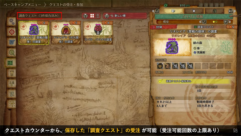 調査クエストを保存することで、クエストカウンターから保存した時の状況でいつでもクエストを開始することができます。保存したクエストの挑戦回数には制限があります。