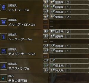 整備Lv3とグループスキルの先達の導きが付いている装備です。とりあえず頭のシルドフードαと脚のアズズパンツαを優先すると良いでしょう。頭と脚ができたら胴か腰を作ってグループスキルの先達の導きを3つ揃えてスキル探索者の幸運を発動させます。