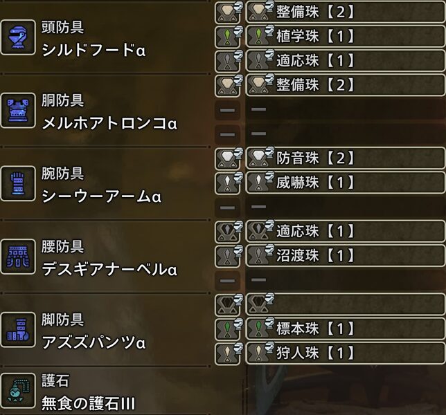 特に必要はありませんが耳栓Lv2が付いている防具です。採集中に大型モンスターの咆哮で邪魔されることを防ぐために耳栓スキルがあると便利です。装飾品の防音珠【2】を3つ付けることでも代用可能なので、2スロがある腕防具であれば防音珠【2】×3と整備珠【2】×2は付けられます。他に付けたい装飾品がある場合はシーウーアームを生産すると良いでしょう。