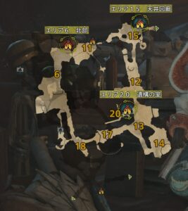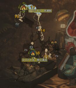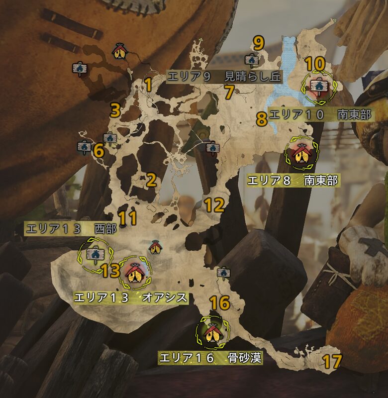 レ・ダウ等が逃げるエリア17に一番近いエリア16骨砂漠もキャンプ地を作っておくと便利です。エリア16にもよくモンスターが移動するので先回りできたりします。