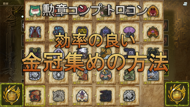 勲章コンプリート、トロフィーコンプリート(トロコン)にも必要なモンスターの最大金冠と最小金冠を効率良く見るけるための方法の紹介です。またモンスターの出現数が多い時間帯も調査しました。