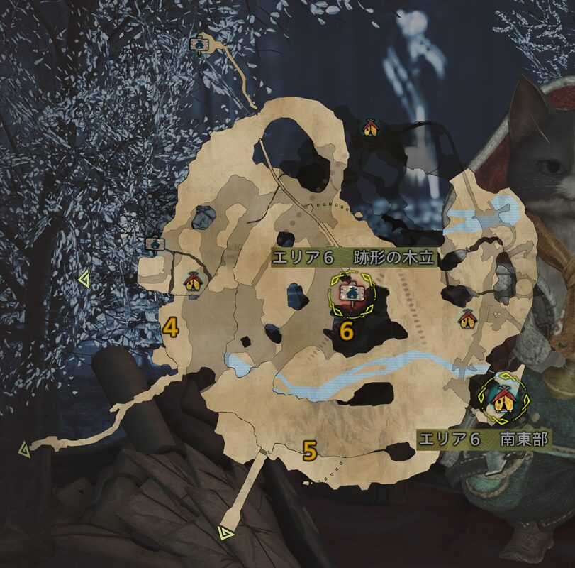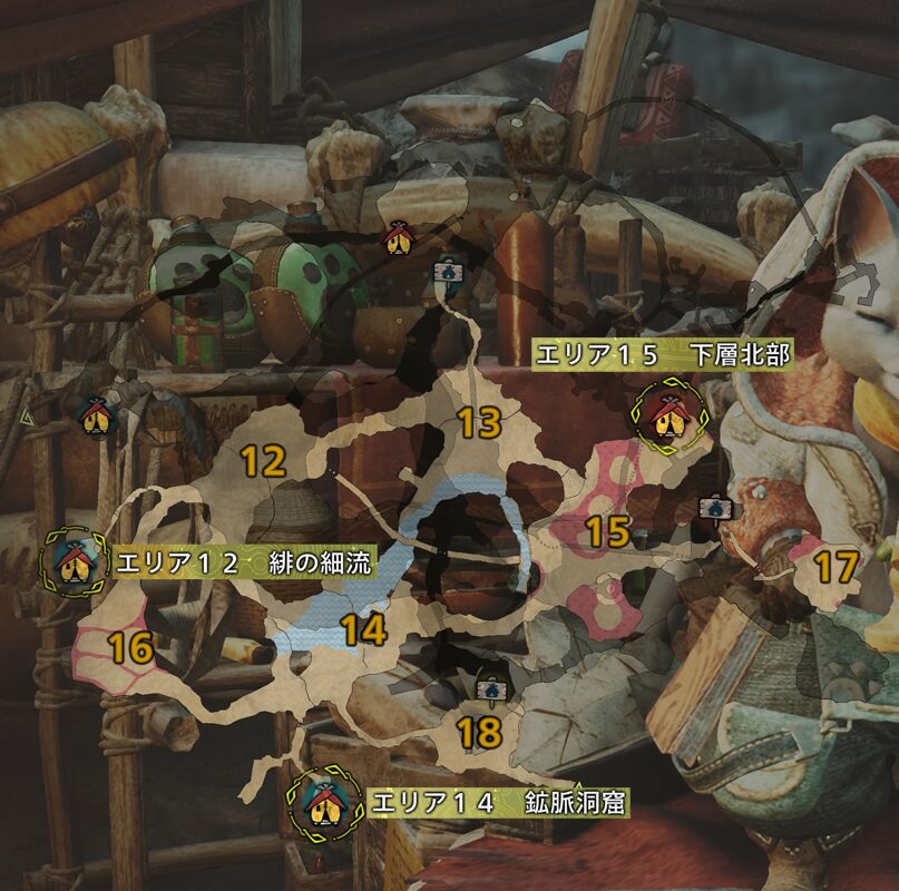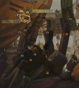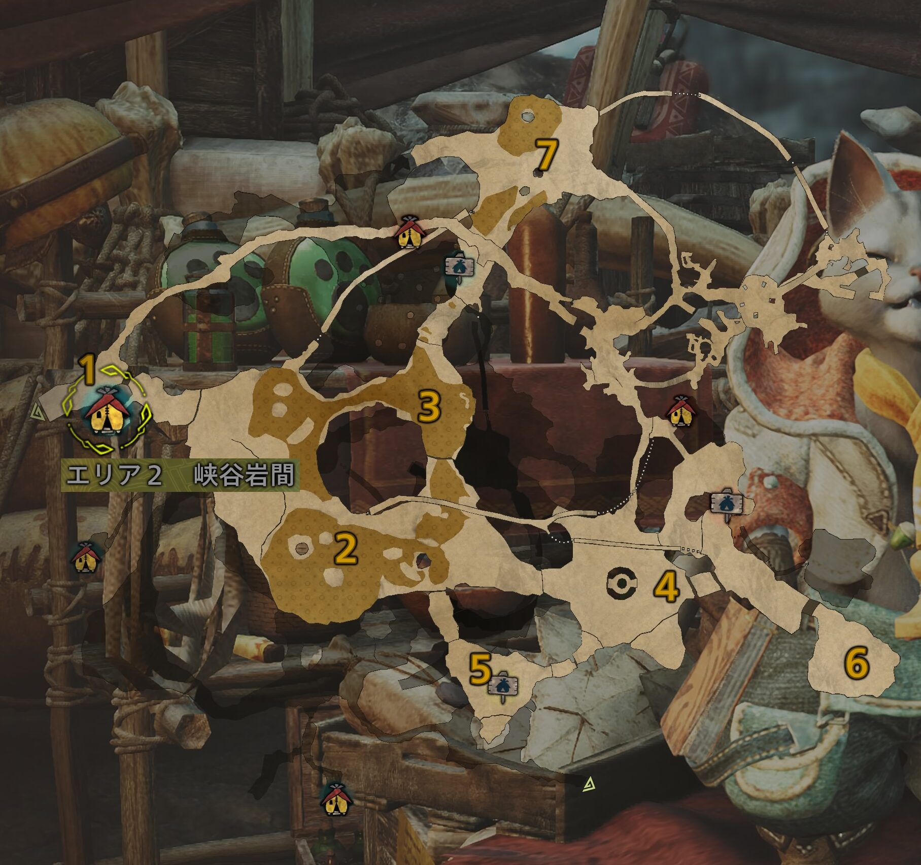 ベースキャンプから遠いエリア2峡谷岩間の簡易キャンプ地があるとエリア2にいるモンスターを確認しやすいです。
