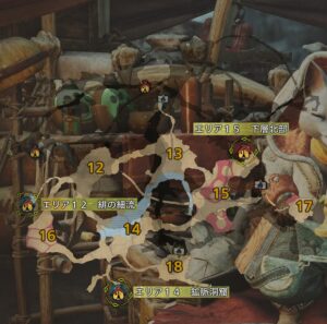 エリア13隠れ横穴は最下層に最も近い簡易キャンプ地です。最下層にはよくモンスターが湧くので絶対作りましょう。まだこのキャンプ地を見つけていない場合は探しに行きましょう。