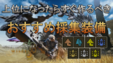 最初に満足感スキルのある腕と、アイテム使用強化スキルがある腰を作ると良いでしょう。キノコ大好きのスキルはもちもの交換の生産素材があるなら脚防具で得て、ない場合は護石か装飾品で補うと良いでしょう。