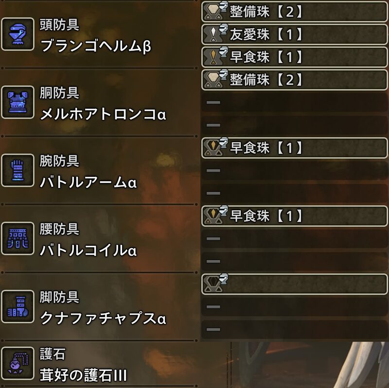 この防具ではアイテムをたくさん使用しますので、食べる・飲む系のアイテムの使用時間が短くなる早食いスキルがあると便利です。残りのスロットに早食珠【1】を付けて早食いLv3にしましょう。