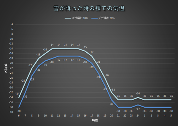 雪原地帯では雪が降るとズブ濡れ状態になり温度がさらに下がります。