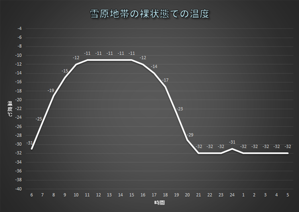 雪原地帯(Arctic biome)では、裸でいると以下のように温度が変化します。